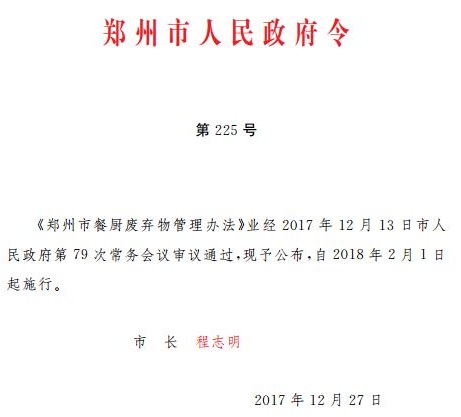 为了加强管理,维护城市市容环境卫生,保障食品安全,促进资源循环利用,近日,市人民政府印发了《郑州市办法》。详情如下:郑州市餐厨废弃物管理办法第一章 总 则第一条 为了加强餐厨废弃物管理,维护城市市容环境卫生,保障食品安全,促进资源循环利用,根据有关法律法规,结合本市实际,制定本办法。第二条 本市实行...