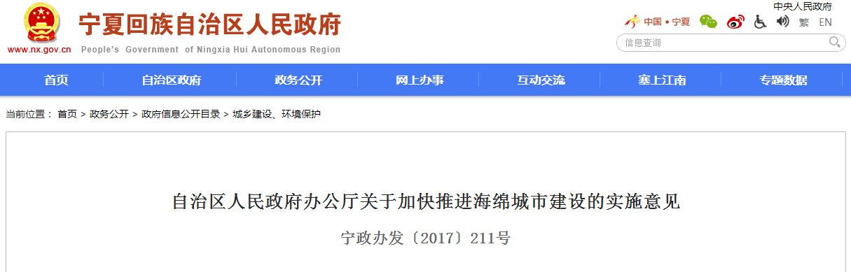 近日,在回族自治区人民政府获悉关于加快推进建设的实施意见,全文如下:自治区人民政府办公厅关于加快推进的实施意见宁政办发〔2017〕211号各市、县(区)人民政府,自治区政府各部门、各直属机构:为加快推进海绵城市建设,提高城市可持续发展能力,根据《国务院办公厅关于推进海绵城市建设的指导意见》(国办发〔...