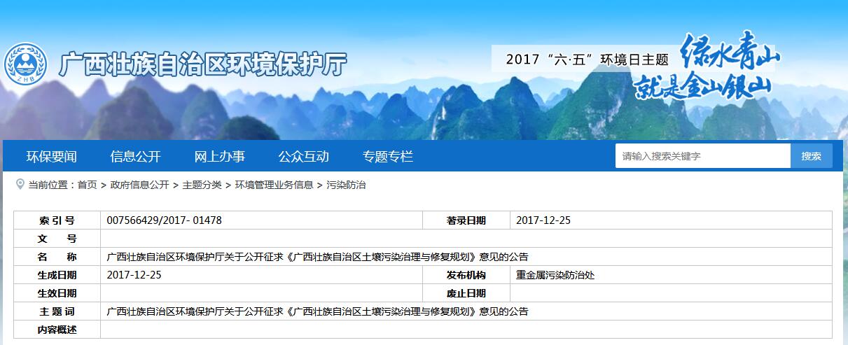 日前,印发《广西壮族自治区与修复规划(2017~2030年)(征求意见稿)》。全文如下:广西壮族自治区环境保护厅关于公开征求《广西壮族自治区土壤污染治理与修复规划》意见的公告为贯彻落实国家、自治区相关土壤环境保护政策方针,解决影响农产品质量、损害群众健康的土壤污染问题,稳步开展土壤污染治理与修复工作...