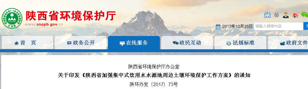 各设区市环保局、韩城市环保局,杨凌示范区环保局,西咸新区环保局,神木市、府谷县环保局:为进一步加强我省保护工作和集中式饮用水水源环境保护,提升饮用水安全保障水平,我厅组织编制了《省加强集中式饮用水水源地周边土壤环境保护工作方案》,现印发给你们,请认真贯彻执行。陕西省环境保护厅办公室2017年12月1...