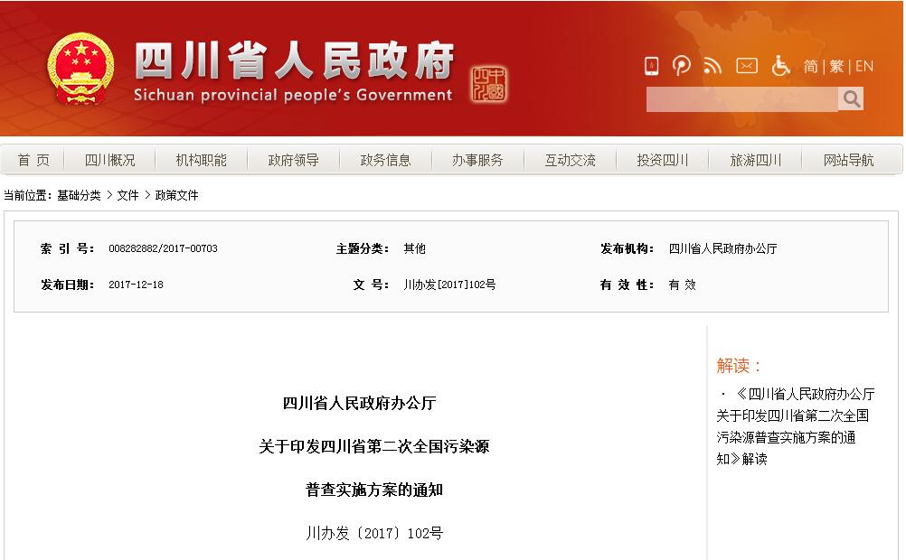 省政府办公厅近日印发《四川省第二次全国普查实施方案》,对四川省第二次全国工作进行全面部署,要求各级各部门在三年内摸清工业污染源、农业污染源、生活污染源、集中式污染治理设施、移动源等各类污染源的情况。普查对象为四川省行政区域内有污染源的单位和个体经营户,普查标准时点为2017年12月31日。普查工作分...
