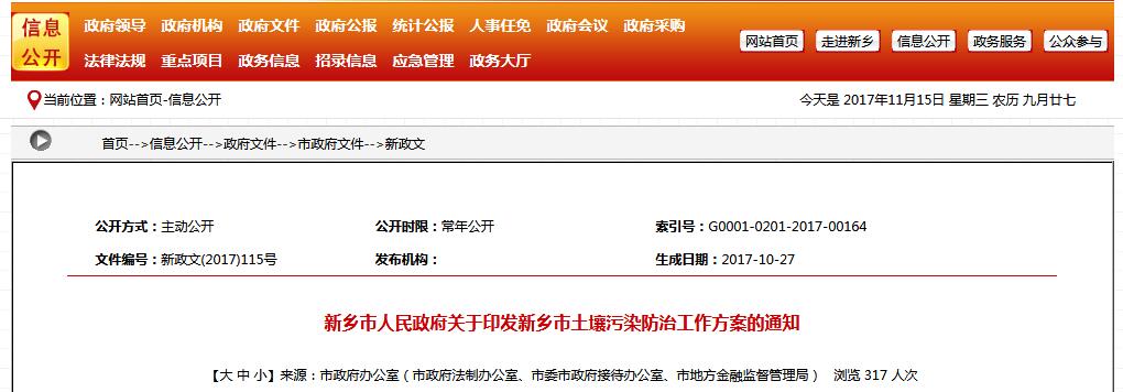 日前,河南新乡市政府印发《新乡市工作方案》。全文如下:新乡市人民政府关于印发新乡市土壤污染防治工作方案的通知各县(市)、区人民政府,市人民政府各部门:《新乡市土壤污染防治工作方案》已经2017年9月13日市政府第76次常务会议研究通过,现印发给你们,请认真贯彻落实。新乡市人民政府2017年10月12...