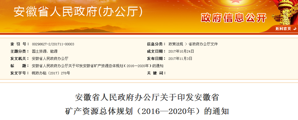近日,省政府印发了《安徽省总体规划(2016—2020年)》,规划提出不断推进矿业结构优化,基本实现矿山企业规模集约开发;大力实施节约与综合利用,转变利用方式,提质增效,实现转型升级的目标。进一步提高绿色矿山达标率(40%),不断加强绿色矿山建设与社会和谐,大力推进绿色矿业示范区建设,基本实现“环境...