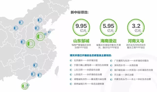 近日,博天环境集团(603603.SH)通过联合体合作方式分别赢取了位于山东省邹城市、河南省义马市和海南省澄迈县的三个生态修复类项目。其中山东省邹城市邹西产煤塌陷区综合治理PPP项目,投资概算约9.95亿元;河南省义马市涧河及石河生态综合整治工程(PPP),项目总投资约3.2亿元;海南省澄迈县城镇水...
