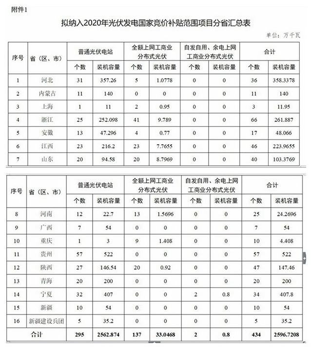 近日,国家能源局发布2020年光伏发电项目国家补贴竞价结果,其中显示,河北、内蒙古等15个省(区、市)和新疆生产建设兵团的434个项目纳入2020年国家竞价补贴范围,总装机容量2596.7208万千瓦。 国家能源局综合司关于公布2020年光伏发电项目国家补贴竞价结果的通知 各省(自治区、直辖市)和新...