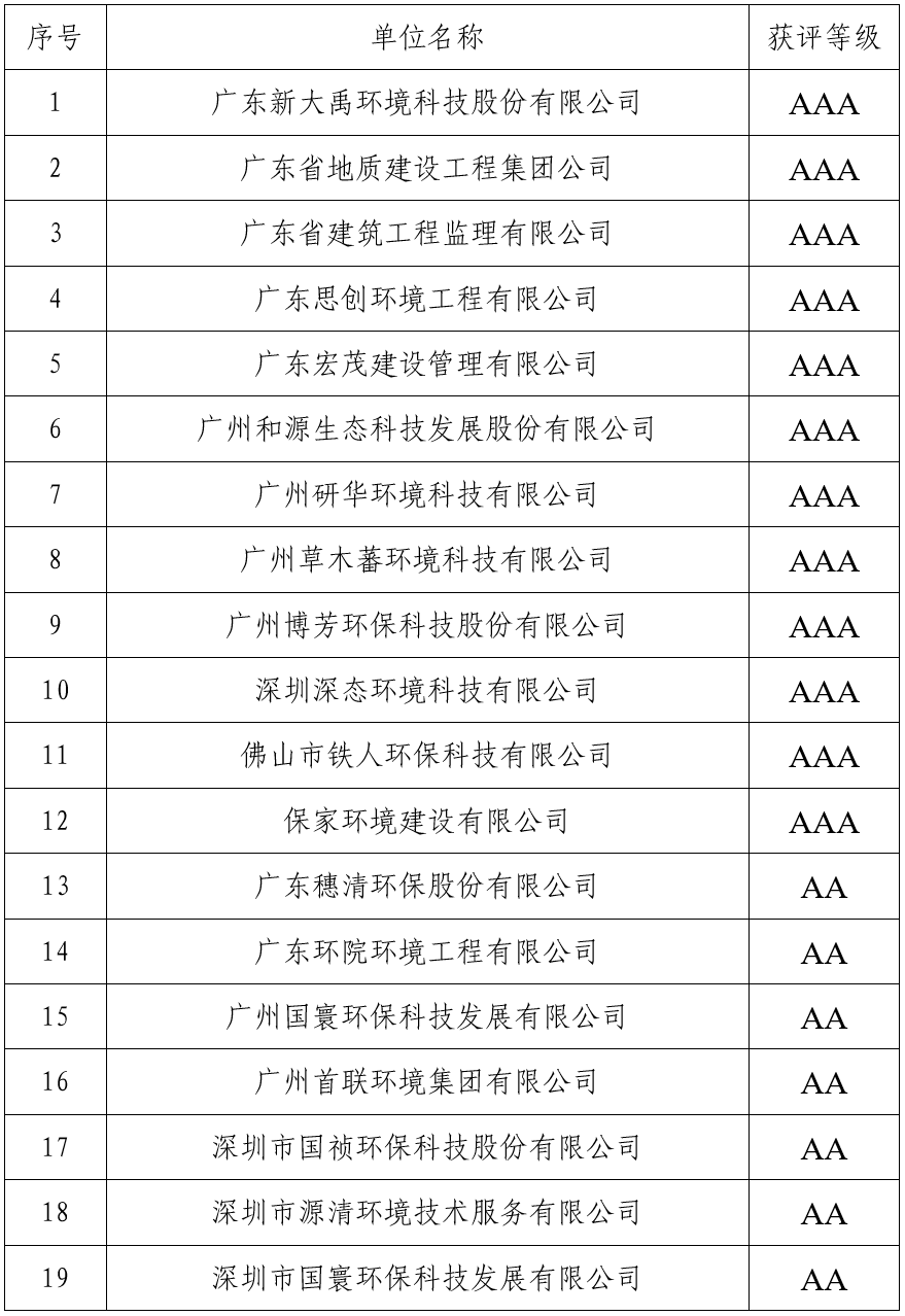 根据《广东省环境保护产业企业信用等级评价管理办法(试行)》的有关规定,广东省环境保护产业协会组织对2020年第一批申报广东省环境保护产业企业信用等级评价的单位进行了核查及评审。初评结果已于2020年6月16日-22日在协会网站上向社会进行公示,公示期间未收到异议。 现将最终评价结果予以发布,广东新大...