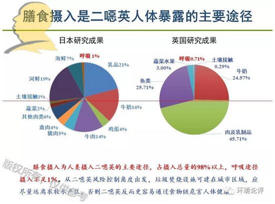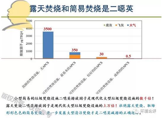 日本、英国的研究表明,膳食摄入是人体二噁英暴露的主要途径,占总摄入量的98%以上,呼吸摄入不足1%,因此从二恶英风险控制角度出发,垃圾焚烧厂可建在城市区域,应尽可能远离农牧水产区。近期南京大学的研究表明,垃圾焚烧二噁英致癌风险较可接受水平低1个数量级。由于简易焚烧、露天焚烧的二噁英排放因子是现代化垃圾焚烧的数千倍至上万倍,我国在普遍推行垃圾分类制度、完善垃圾分类处理系统过程中,应坚决杜绝露天焚烧、取缔简易焚烧,坚定不移地发展现代化大型清洁垃圾焚烧。