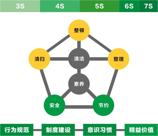 7S的在企业推行,从现场的定置定位和员工的行为规范开始,然后通过制度建设持之以恒,使员工慢慢形成意识,养成良好的工作习惯,最后成为企业的文化,产生核心的文化软实力。立正顾问机构认为,这是一个从现场改变到氛围改变,最后到文化改变的过程。