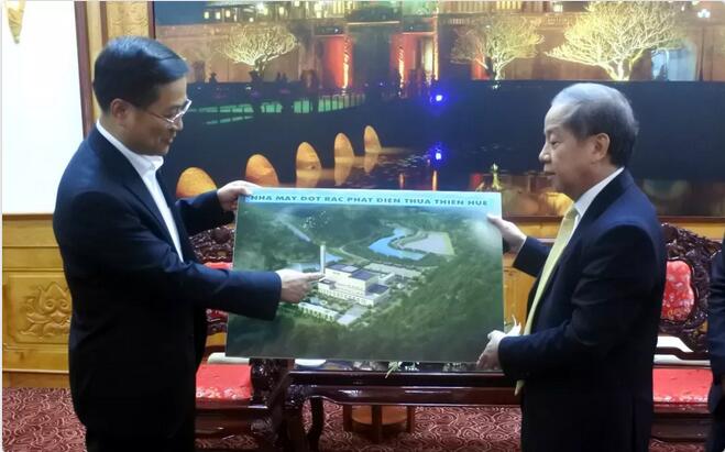 签约仪式前,王天义总裁与潘玉寿主席就顺化项目投资合作进行了坦诚友好的交流。王天义总裁表示,光大国际是亚洲最大的垃圾发电投资运营商,积累了世界一流的技术与管理经验,刚投产运营的芹苴项目为光大国际进一步开拓越南市场提供了宝贵的经验,我们对越南投资环境也充满信心。我们有信心有能力将顺化项目建设得更快更好,并不断扩大在越南的投资合作,希望双方加快合同个别细节谈判,早日开工建设。潘玉寿主席对此表示完全赞同,并就顺化项目提出两点希望,一是希望光大国际将顺化项目建成环境优美、品质优异的垃圾发电项目,二是希望双方鼎力配合,加快项目建设进程,尽快实现投产运营。签约仪式后,王天义总裁还向潘玉寿主席展示了顺化项目设计效果图。