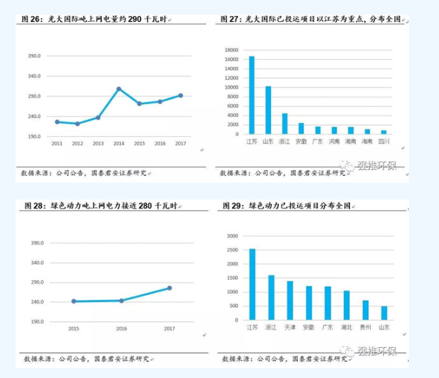 京津冀:泰达环保运营项目主要位于天津、大连等地,2017年吨上网电量300千瓦时以上。北控环境运营项目主要位于北京和全国其他区域,吨上网电量接近250千瓦时。