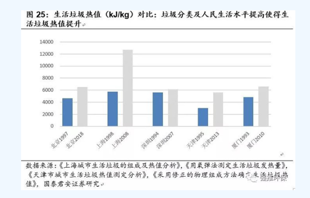 Ø垃圾分类收集推进:研究表明,剩余垃圾的水分含量会随着生物质垃圾分类率的提高而降低,当生物质垃圾分类率为20%时,剩余垃圾的低位热值将由4419kJ/kg升高5465kJ/kg;如果生物质垃圾分类率达到39%,剩余垃圾的低位热值将达到7000kJ/kg。以深圳为例,随着生活垃圾分类的推进,厨余垃圾逐年减少,根据深能环保的研究,2014年深圳入垃圾焚烧厂的垃圾中餐厨含量达到30.7%,相比2010年降低了13.4%;低位热值提高到7144kJ/kg,提升了约14.7%。