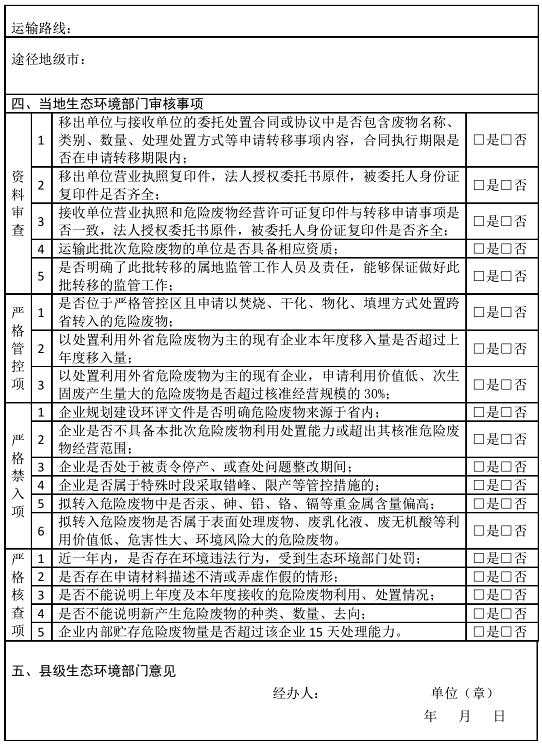 (三)对于具备条件接收跨省转入危险废物的,相关市、县(市、区)生态环境部门要严格核查并出具核查意见。接收单位存在下述情形之一的,市级生态环境局不得出具同意接收的意见: