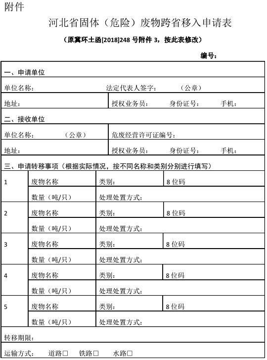 二、从严把控危险废物跨省转入。各级生态环境部门要认真贯彻《河北省固体废物污染环境防治条例》,严格控制省外的危险废物转移至我省行政区域内贮存或者处置。要对照“河北省固体(危险)废物跨省移入申请表”(附件),从严核查跨省转入申请。