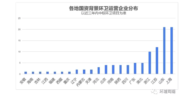 另外,据环境司南不完全统计,除了活跃在招投标领域的北京环境卫生工程集团、临沂环境卫生集团、寿光环卫集团、日照环卫集团等集团化企业外,近三年来中标环卫项目的各类国资背景环卫运营企业数量超过100家,主要集中在华东地区,华东地区的此类企业占全国总量的60%以上。