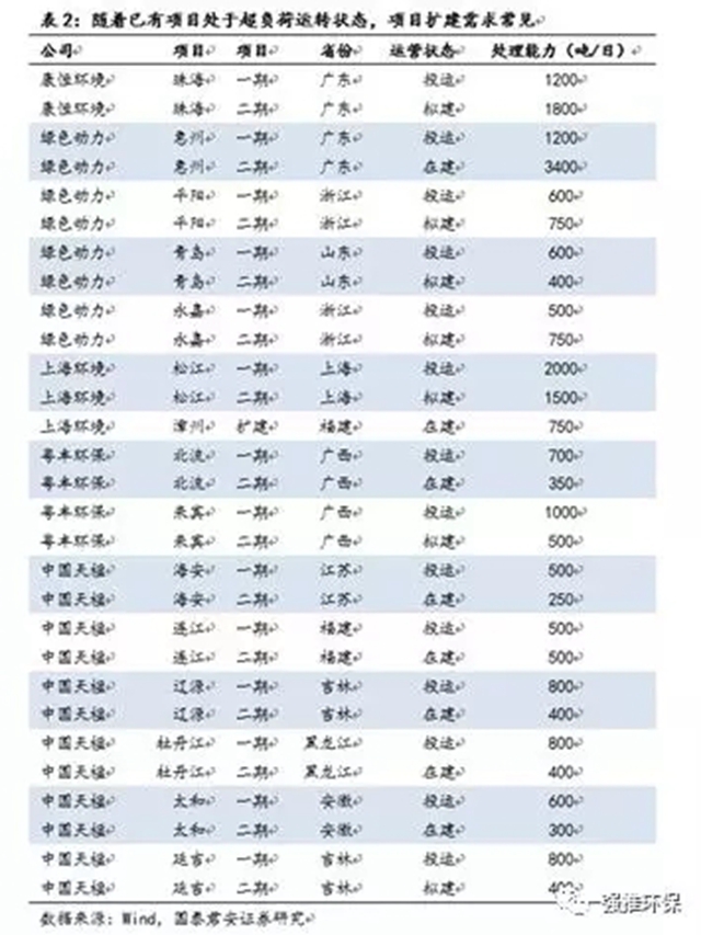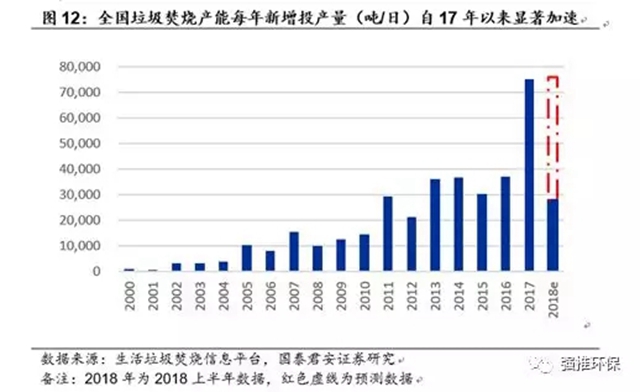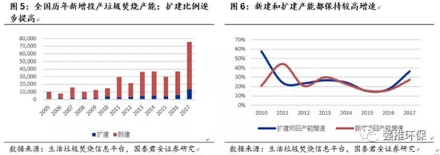 在已投运的362个项目中,其中175个为单体项目,187个已经或正在二期及三期扩建。截止2018上半年,仍有10万吨/日的扩建项目正在建设中。这证明了我们的判断,行业经过多年的发展,随着目前已建成的项目成熟运行及项目周边垃圾处理需求量的增加,已有项目处于超负荷运转状态,近几年来进入扩建需求强烈的高峰期。