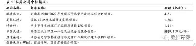 根据公告与招投标信息统计,本周环保公司中新增订单5单、中标总金额7.76亿;新增订单前三名分别为洪城水业、高能环境和博世科。
