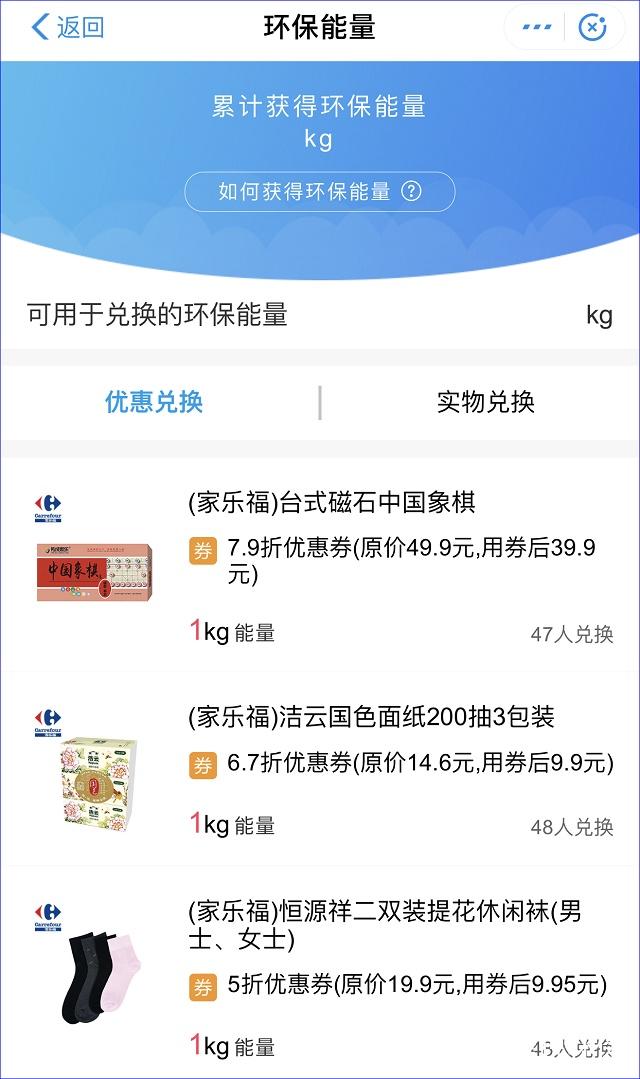 对于回收价值比较低的物品,可以按照重量兑换“能量”,然后利用能量在“环保商城”兑换优惠券或者实物。