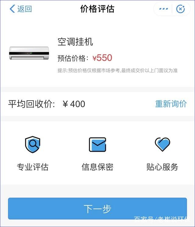 举个例子,老崔家里有个需要回收的空调,选择挂机或柜机,品牌、出厂年限、空调匹数、内外机破损程度、功能使用情况,系统会自动给一个预估价(成交价以上门面议为准)。