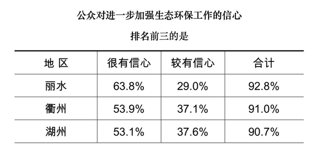 88.7%的公众对本地党委政府进一步加强生态建设和环境保护工作、建设美丽浙江充满信心,全省五个地区对进一步加强生态环保工作的信心率超过九成,其中丽水最高。