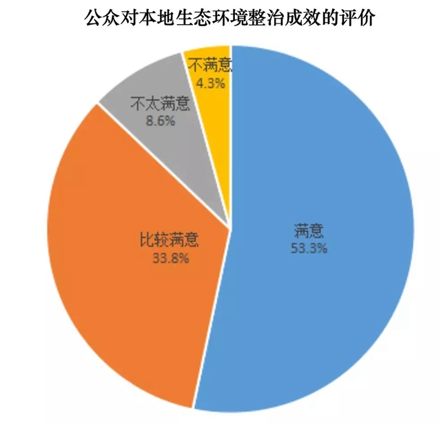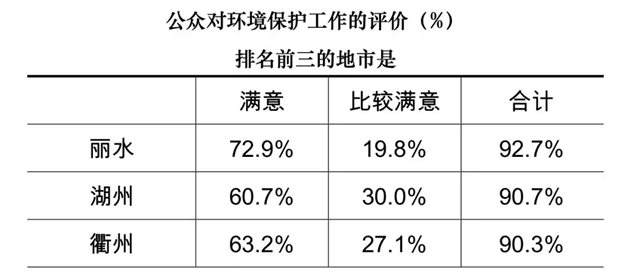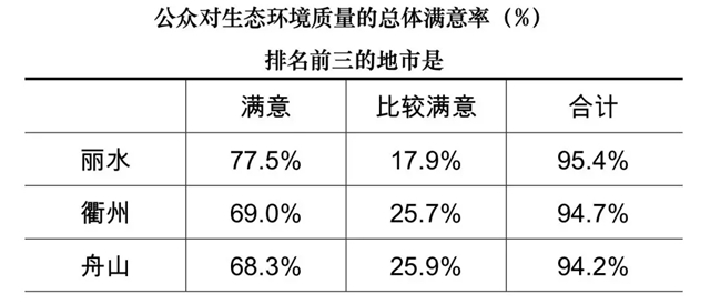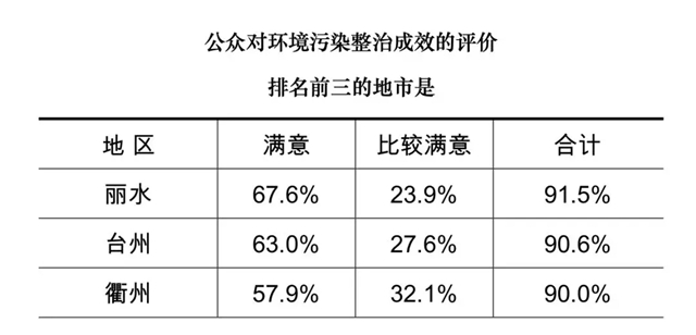 87.1%的公众对生态环境整治成效表示满意,丽水、台州和衢州的公众对生态环境整治成效的满意率超过九成。