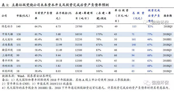 我们测算,存量项目达产后,9家垃圾焚烧重点上市公司平均资产负债率提升至66%。目前主要垃圾焚烧上市公司资产负债率平均为54%,在手现金与市值之比平均为12%:1)A股公司采用2018年三季报数据,港股公司采用2018年半年报数据;所有货币单位统一为CNY。2)目前资产负债率:各公司平均值为54%,目前旺能环境最低(38.4%),绿色动力最高(64.5%),光大国际2018H1为61%,考虑供股融资后,资产负债率将下降为55%。3)在手现金:各公司在手现金与市值之比平均值为12%,光大国际在手现金最为充沛,远高于行业平均水平。