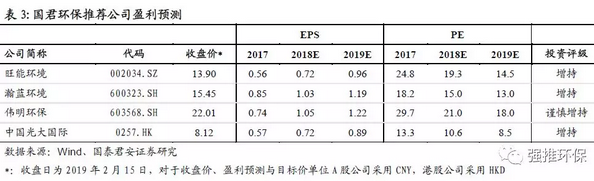 配置垃圾焚烧板块中处于成长期的龙头公司,推荐产能释放加速、盈利能力改善、项目优质的公司,包括:1)2019年为产能释放大年、利润率改善明显的旺能环境;2)项目多位于浙江地区、盈利能力强的伟明环保;3)项目多位于珠三角地区、运营稳健的瀚蓝环境;4)行业产能第一龙头中国光大国际。