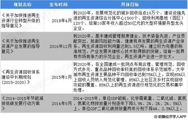 近些年,国家为了鼓励居民和企业进行资源回收,相继实施了一系列政策,如2016年5月,商务部等六部门颁布了《关于推进再生资源回收行业转型升级的意见》,其中指出要加快转变发展方式、促进行业转型升级为主线,顺应"互联网+"发展趋势,着力推动再生资源回收模式创新,推动经营模式由粗放型向集约型转变,推动组织形式由劳动密集型向劳动、资本和技术密集型并重转变,建立健全完善的再生资源回收体系。2019年3月,工信部和国开行联合发布了《关于加快推进工业节能与绿色发展的通知》,指出在有条件的城镇推动水泥窑协同处置生活垃圾,推动废铜铁、废塑料等再生资源综合利用;重点支持开展退役新能源汽车动力蓄电池梯级利用和再利用。