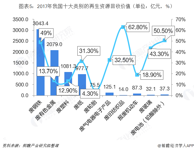 2017年,我国十大品种再生资源回收总值为7550.7亿元,受主要品种价格上涨影响,同比增长28.7%,所有再生资源品种回收总值均有增长。其中,废旧纺织品增幅最高,同比增长62.8%,但是回收价值最低,仅为14亿元;废轮胎增幅相对最小,同比增长4.3%;废钢铁的回收价值最高,达到3043.4亿元。