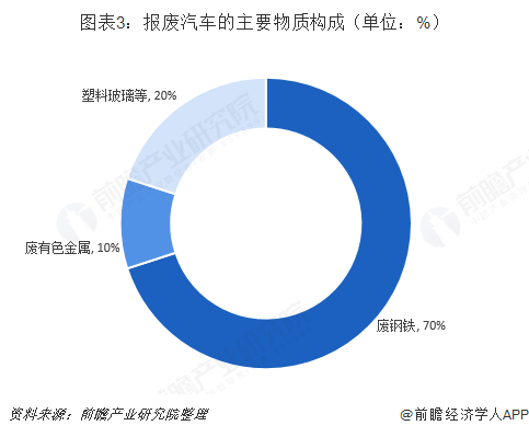 报废汽车主要含有黑色金属、有色金属、贵金属(催化剂)、电子设备、玻璃、车用塑料等。其中,废钢等黑色金属约占70%,铜铝等有色金属约占10%,其他物料约占20%。其中废钢铁、有色金属90%以上都可以回收利用,玻璃、塑料等的回收利用率也可达50%以上。可见报废汽车的再回收利用价值较大。