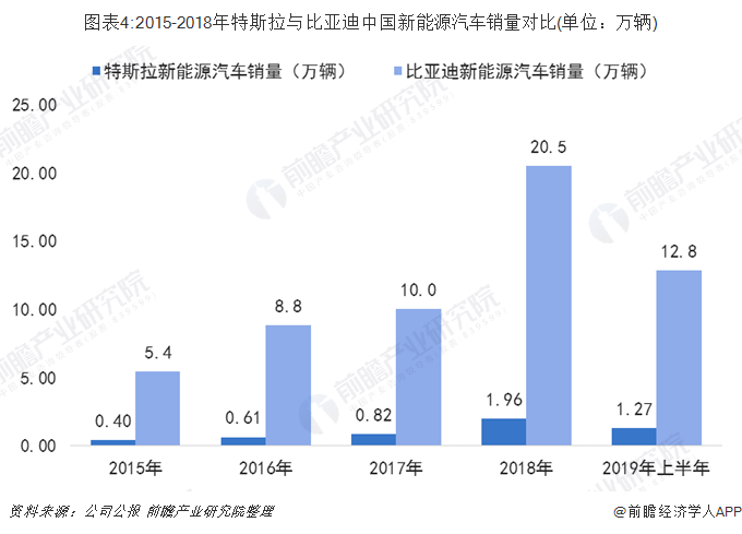 2015-2018年,比亚迪和特斯拉在中国的新能源汽车销量逐渐增长,但销量差距较大,2018年比亚迪在中国的新能源汽车销量是特斯拉的十倍。2019年上半年,特斯拉新能源汽车在中国的销量约为1万辆,而比亚迪超12万辆。