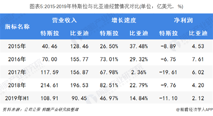 2015-2017年,比亚迪营业收入高于特斯拉,但随着近年来特斯拉营业收入增长速度的加快,2018年,特斯拉营业收入超过比亚迪,2019年上半年,特斯拉实现营业收入108.91亿美元,较2018年同期增长46.97%,而比亚迪2019年上半年营收达90.45亿美元,营收增长率为14.84%。在营业收入上,比亚迪较特斯拉仍有待提高;2015-2018年,从整体上看,特斯拉净利润波动变化,连年亏损,比亚迪净利润虽然持续减少,但比亚迪净利润高于特斯拉。