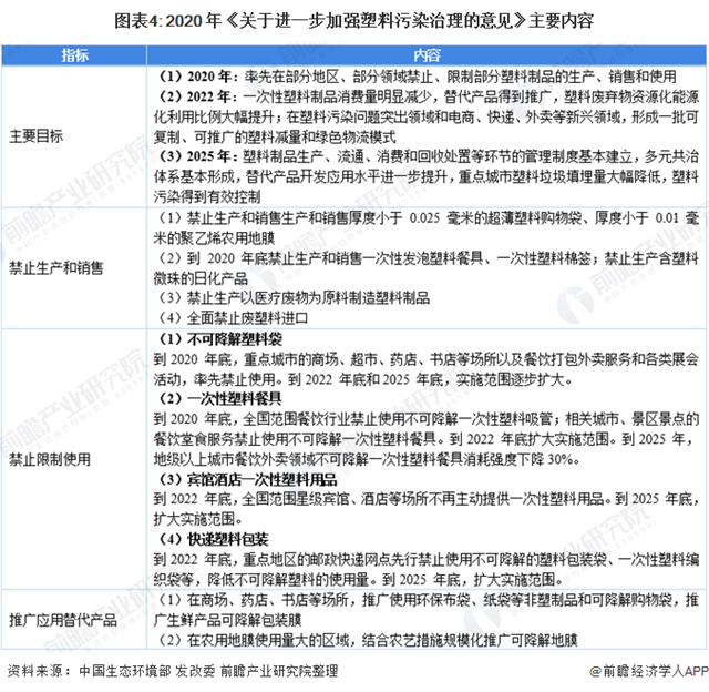 2020 年1 月19 日,国家发展改革委、生态环境部公布《关于进一步加强塑料污染治理的意见》,提出要有序禁止、限制部分塑料制品的生产、销售和使用,对不可降解塑料袋、一次性塑料餐具、宾馆酒店一次性塑料用品、快递塑料包装等多领域塑料的使用进行分阶段管理,提出要积极推广替代产品,规范塑料废弃物回收利用,建立健全塑料制品生产、流通、使用、回收处置等环节的管理制度。