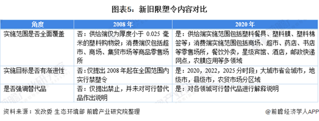 一方面旧版限塑令中仅限制使用厚度小于0.025 毫米的塑料购物袋,而在新版限塑令中则除了0.025毫米的塑料购物袋被限制外,还包括厚度小于 0.01 毫米的聚乙烯农用地膜、一次性发泡塑料餐具、一次性塑料棉签、塑料微珠的日化产品,并全面禁止废塑料进口。