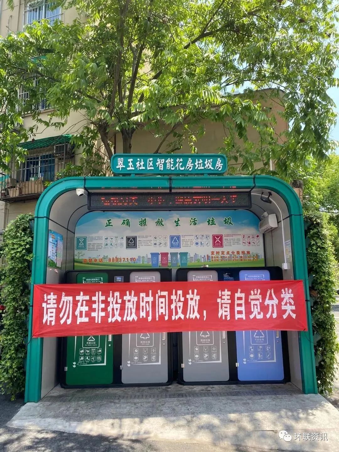 为了祛除垃圾房的异味,翠玉社区垃圾房两侧挂满了植物花卉盆栽,在房内也安装了一台臭氧发生器除味,还新增太阳能自动浇灌绿植、电子显示屏宣传、垃圾投放量自主监测、紫外线消毒、感应智能照明等功能。