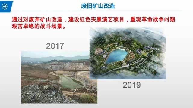 一是建设红色实景演艺项目。该项目原址是一座大型废弃矿山,通过对矿山进行改造,既能对废弃矿山进行100%资源利用,又能重现革命战争时期艰苦卓绝的战斗场景。