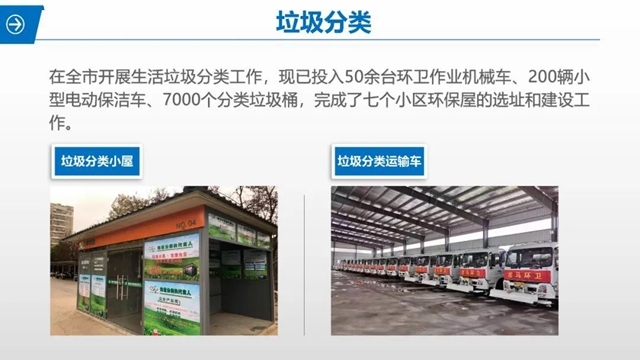 三是在全市开展生活垃圾分类工作。现已投入50余台环卫作业机械车、200辆小型电动保洁车、7000个分类垃圾桶,完成了七个小区环保屋的选址和建设工作。
