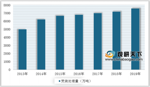 与发达国家无害化处理率相比,我国生活垃圾无害化处理水平仍然存在较大发展空间。根据《“十三五”全国城镇生活垃圾无害化处理设施建设规划》,到2020年底,直辖市、计划单列市和省会城市(建成区)生活垃圾无害化处理率将达到100%;其他设市城市生活垃圾无害化处理率达到95%以上,县城(建成区)生活垃圾无害化处理率达到80%以上,建制镇生活垃圾无害化处理率达到70%以上,特殊困难地区可适当放宽。随着城市生活垃圾“减量化、资源化、无害化”处理需求日益增长,我国垃圾焚烧处理近年来发展迅速。数据显示,截止到2019年底,我国拥有城市生活垃圾焚烧发电项目共278个,垃圾焚烧处理率提升至35.30%;年垃圾焚烧处理量达到7589万吨,同比增长2.86%。△2013-2019年我国城市生活垃圾焚烧处理量