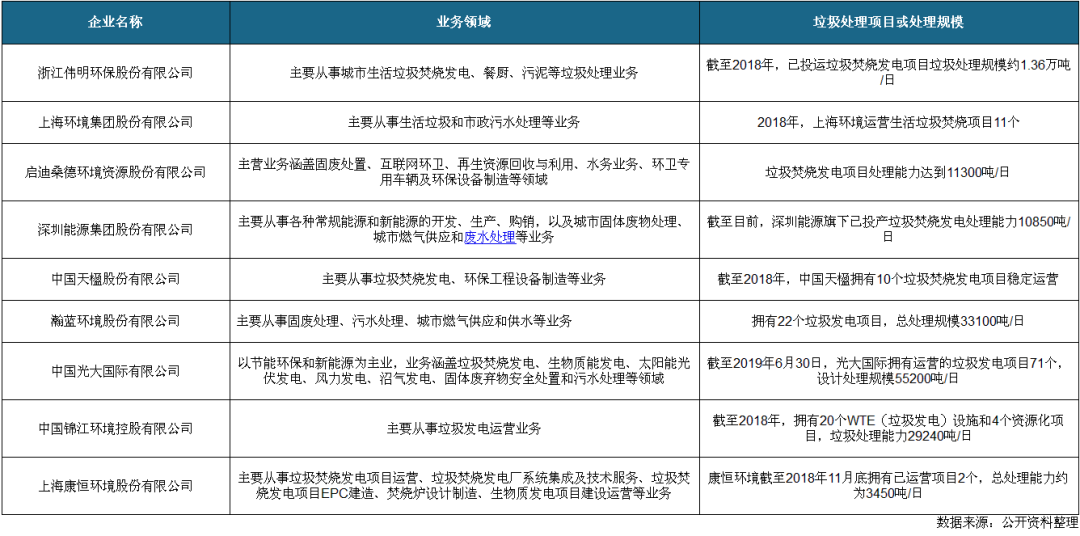 垃圾处理行业属于资金及技术密集型行业,对投资方资金实力及技术水平要求较高。随着市场竞争日趋激烈以及国家环保要求日益提高,拥有较强融资能力以及技术水平的运营商竞争优势明显,行业集中度呈现上升趋势。△我国垃圾处理行业相关企业业务及处理能力情况