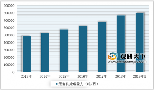 近年来,各地区、各部门不断加大城市生活垃圾无害化处理工作力度,城市生活垃圾无害化处理能力、实际处理量、处理率均稳步增长。在无害化处理能力方面,2018年城市生活垃圾无害化处理能力766195吨/日,无害化处理量22565万吨,其中填埋处理量17125.07万吨,焚烧处理量9321.50万吨,其他(包括堆肥)处理量727.53万吨,填埋仍然是我国城市生活垃圾无害化处理的主要方式。△2013-2019年我国城市生活垃圾无害化处理能力及预测情况