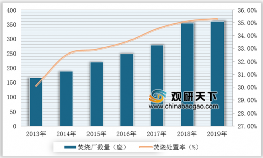 △2013-2019年中国城市生活垃圾焚烧厂数量及焚烧处理率