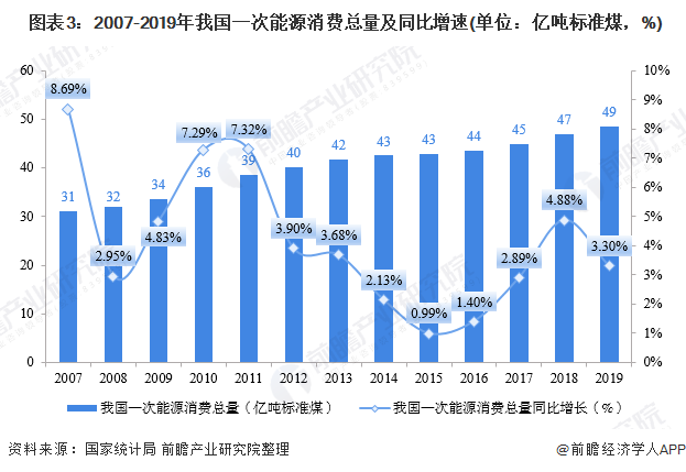 从能源消费的角度来看,2007-2019年,我国的能源消费总量呈逐年增长趋势,其中,2007年,我国的一次能源消费总量为31.14亿吨标准煤,同比增长8.69%,为近年来最大增幅;2019年我国能源消费总量达到48.60亿吨标准煤,同比增长3.30%。