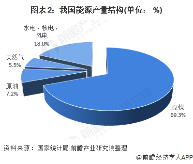 从我国能源生产结构来看,2018年,原煤产量为26.13亿吨标准煤,占比为69.30%,占据我国能源产量的主导地位;水电、核电、风电的产量为6.79亿吨标准煤,占比为18%。