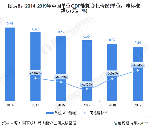 能源的利用效率可以从单位GDP能耗及相关系数上来体现。2014-2019年,我国单位GDP能耗逐年下降,意味着我国能源利用效率逐年增长。2019年,我国每万元GDP消费0.49吨标准煤,较2018年下降4.84%。