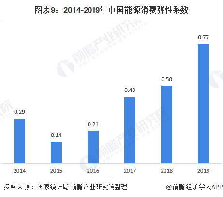 能源消费弹性系数为能源消费量年平均增长速度与国民经济年平均增长速度的比值,在一定程度上可以展示国民经济发展与能源消费间的关系。2014-2019年,我国能源消费弹性系数先下降后增长。2019年,我国能源消费弹性系数为0.77,较2018年有较大增长,但低于1,说明我国能源消费的增速的低于我国国民经济的增长幅度。