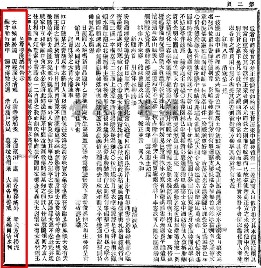 1872年12月27日《申报》一则题为“邑尊捞浅城河告示”的消息,其中提及“沿河铺户居民 莫将垃圾倾弃 大众各相警戒 庶几同沾水利”