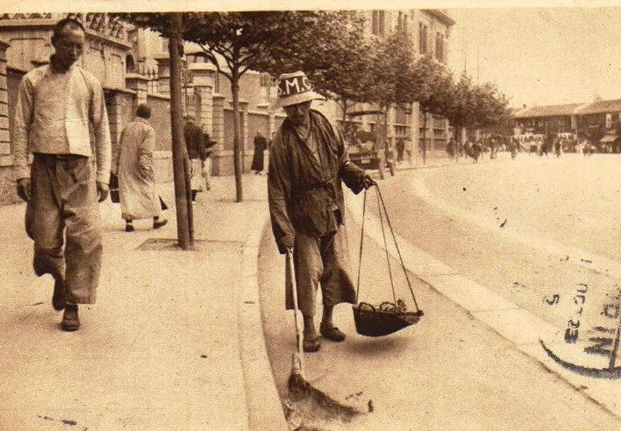 民国初年,上海街头的清道夫。帽子上有S.M.C 字样,意为上海工部局的英文缩写