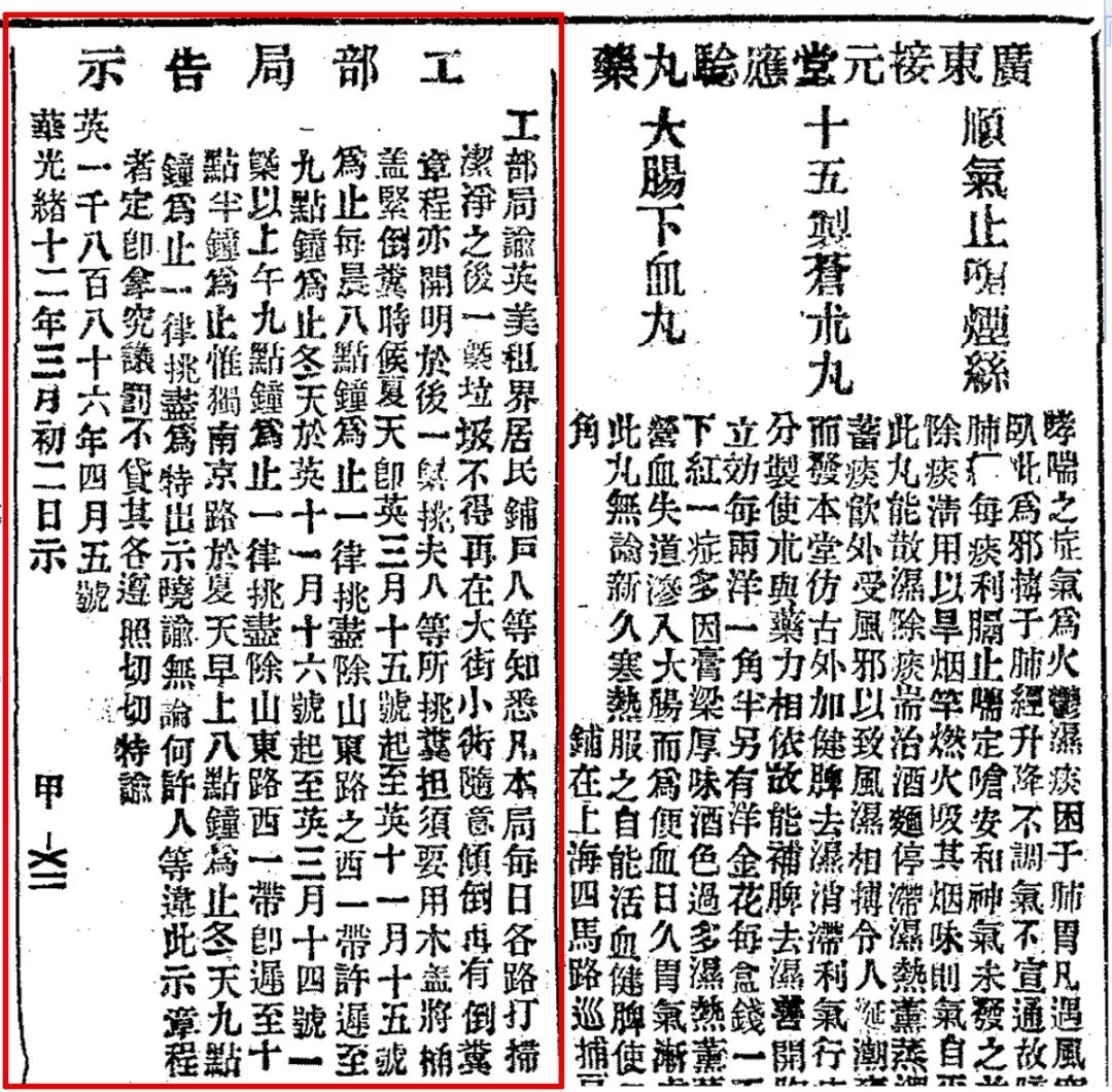 1886年4月30日《申报》刊登租界当局关于定时收集垃圾和粪便的通告
