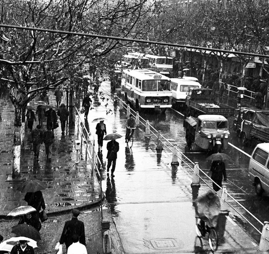 1981年的上海街景。图中那辆三轮环卫车辆,很可能是上海市工具修配厂1968年开始试制,20世纪70年代的主力环卫垃圾清运车——工农牌手把式三轮机动垃圾车(陆杰/摄)