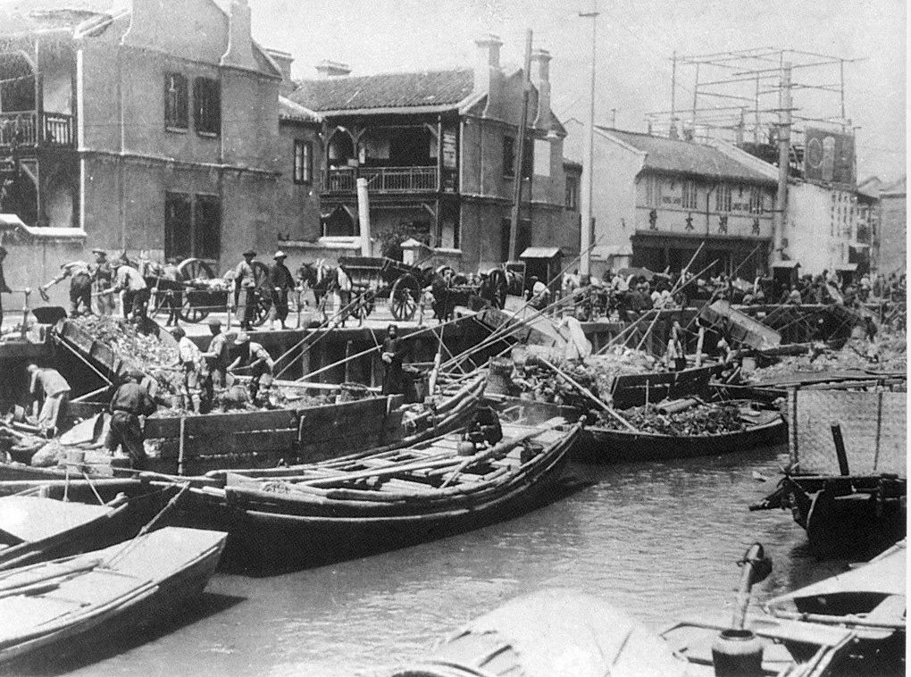 20世纪30年代,市区河道边的垃圾清运。图中可见,工人直接将堆放的垃圾装入驳船中运走