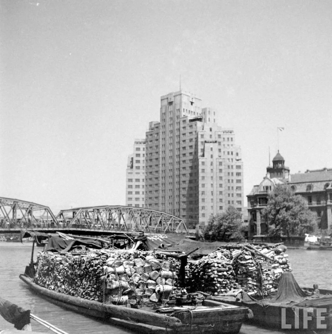 20世纪40年代后期,苏州河口中运输垃圾的驳船。图中可见,装载的垃圾已经过初步归类